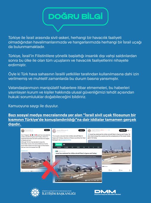 Cumhurbaşkanlığı İrtibat Başkanlığı Dezenformasyonla Çaba Merkezi (DMM), son günlerde toplumsal medyada dolaşan “İsrail sivil uçak filosunun bir kısmının Türkiye’de konuşlandırıldığı” savının büsbütün gerçek dışı olduğunu açıkladı. Yapılan resmi açıklamada, bu çeşit tezlerin gerçeği yansıtmadığı ve kamuoyunun yanlış bilgilendirildiği vurgulandı.