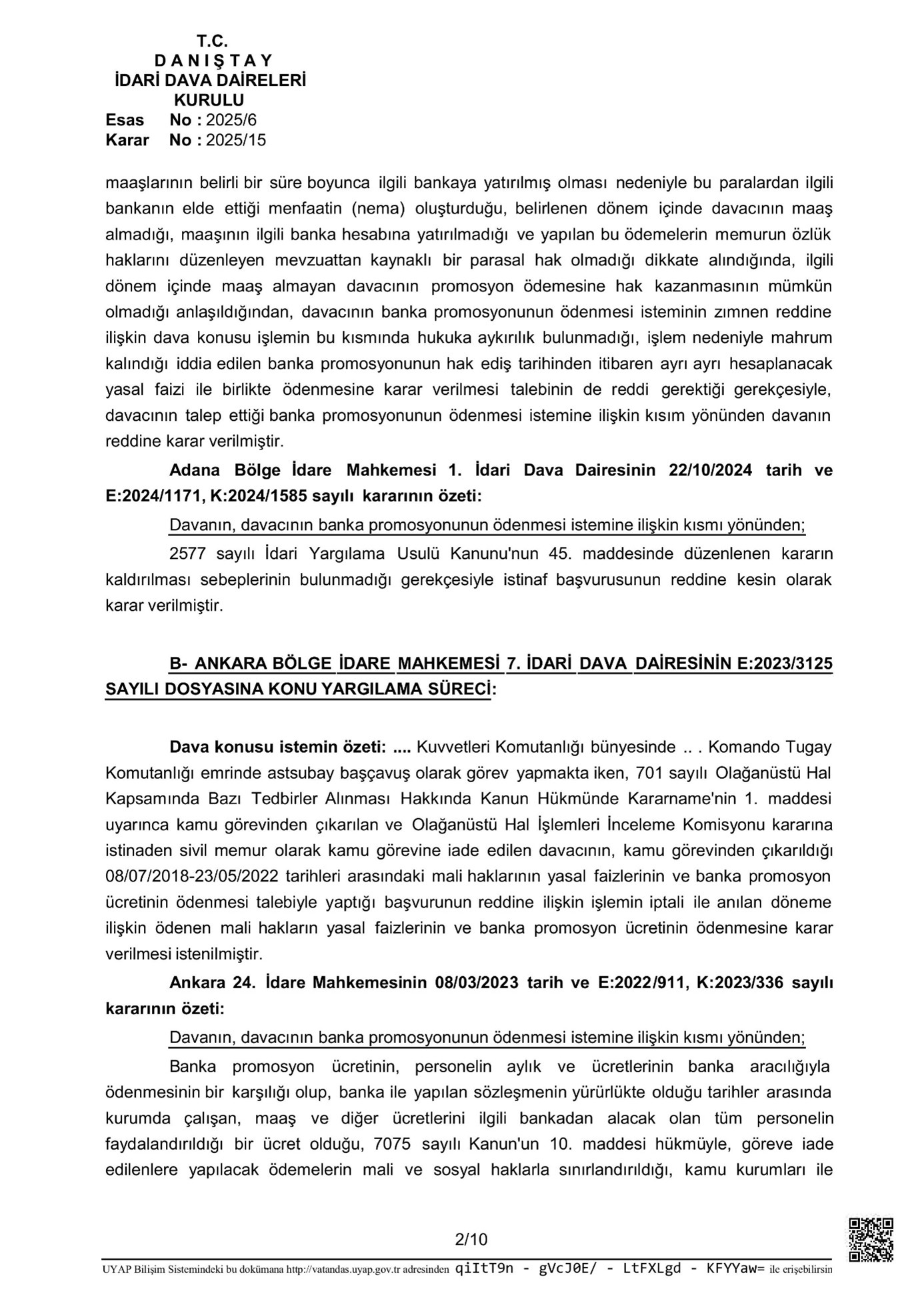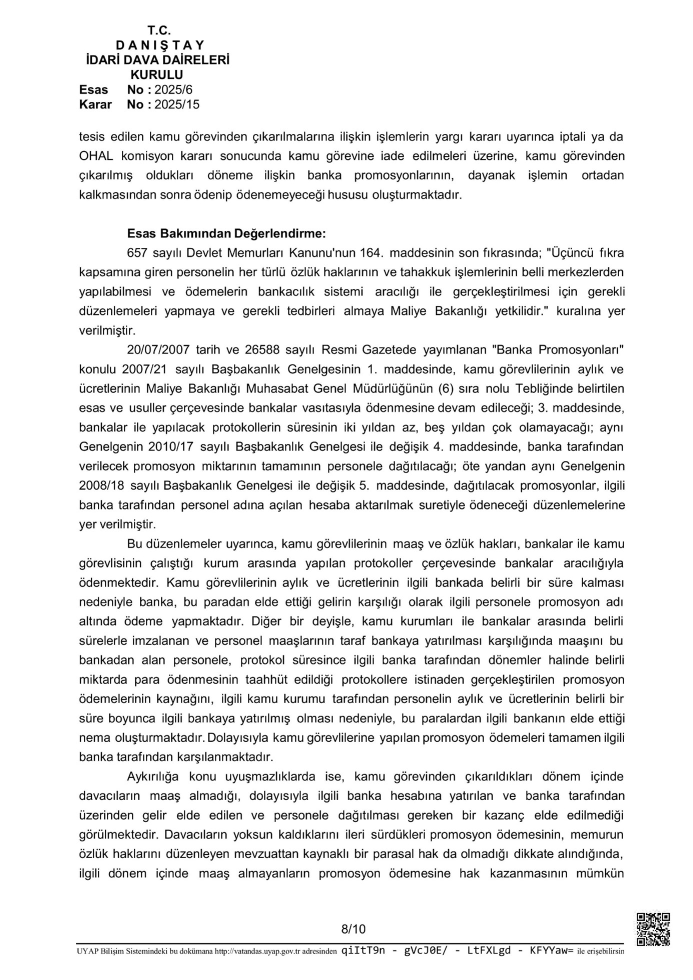 İdari Dava Daireleri Kurulu tarafından yapılan değerlendirmede özetle; banka promosyonuna dair süreçlerin memurların özlük haklarını düzenleyen mevzuata dayanmadığı, kamu misyonundan çıkarılan bireylerin bu periyotta maaş almadıkları, hasebiyle maaşa dayalı olarak banka tarafından rastgele bir gelir elde edilmediği dikkate alındığında promosyon ödemesinin yapılmasının imkanlı olmadığı tabir edilmiştir.
