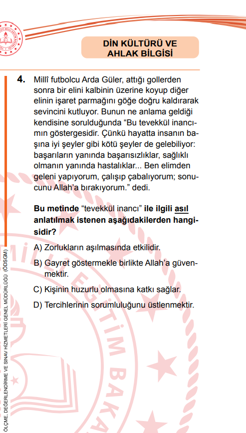 Ardından öğrencilere, “Bu metinde ‘tevekkül inancı’ ile ilgili asıl anlatılmak istenen aşağıdakilerden hangisidir?” sorusu yöneltildi.