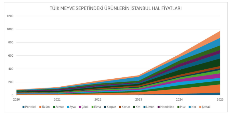 Her meyvenin haziran ayındaki İstanbul Hali’ndeki en alt ve en üst fiyatlarının ortalaması alındığında, 2020 yılında birer kiloluk meyve sepeti 86 TL tutarken, 2025 yılında bu meblağ 975 TL oluyor.