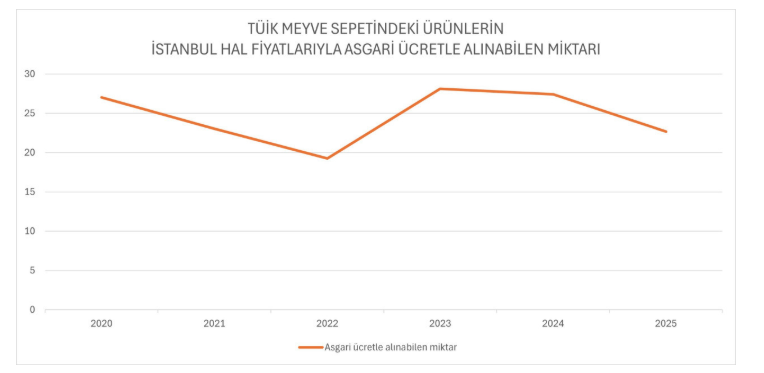 Türkiye İstatistik Kurumu’nun (TÜİK) enflasyon hesaplamasında kullandığı husus sepetinde yer alan meyveler, İstanbul Hali çıkış fiyatlarıyla hesaplandığında son 5 yılda minimum ücretlinin alım gücü değişimi dikkat çekiyor.