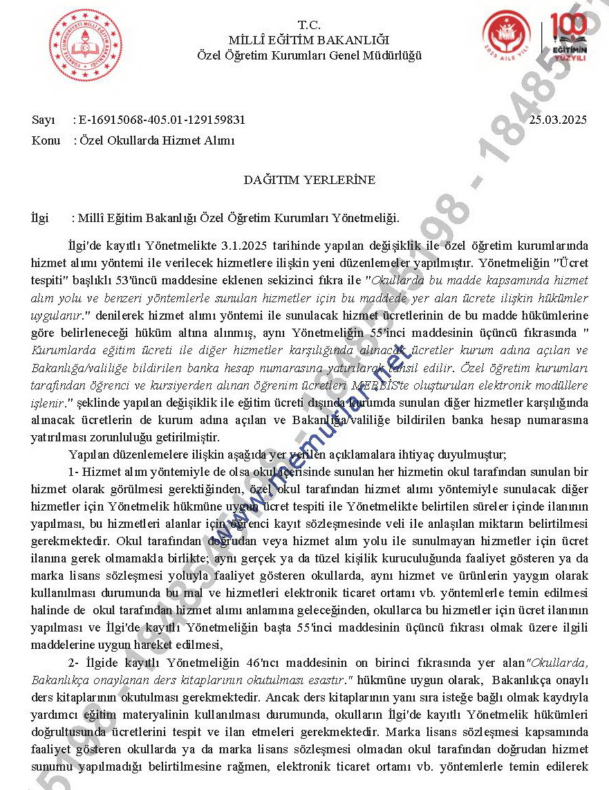 Milli Eğitim Bakanlığı Özel Öğretim Kurumları Genel Müdürlüğünün 25/03/2025 tarih ve 129159831 sayılı yazılarında aşağıdaki açıklamalara yer verilmiştir.