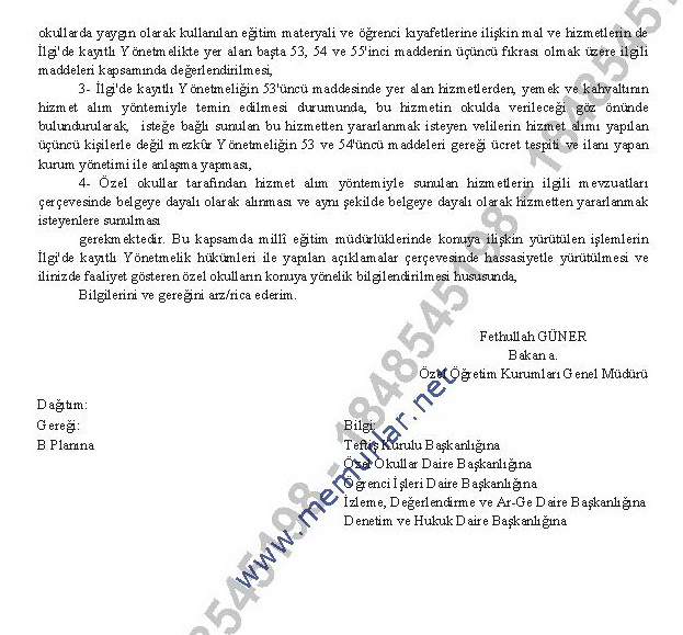 1- Hizmet alım yoluyla de olsa okul içerisinde sunulan her hizmetin okul tarafından sunulan bir hizmet olarak görülmesi gerektiğinden, özel okul tarafından hizmet alımı tekniğiyle sunulacak öteki hizmetler için Yönetmelik kararına uygun fiyat tespiti ile Yönetmelikte belirtilen müddetler içinde ilanının yapılması, bu hizmetleri alanlar için öğrenci kayıt kontratında veli ile anlaşılan ölçünün belirtilmesi gerekmektedir. Okul tarafından direkt yahut hizmet alım yolu ile sunulmayan hizmetler için fiyat ilanına gerek olmamakla birlikte; tıpkı gerçek ya da hukuksal kişilik kuruculuğunda faaliyet gösteren ya da marka lisans mukavelesi yoluyla faaliyet gösteren okullarda, birebir hizmet ve eserlerin yaygın olarak kullanılması durumunda bu mal ve hizmetleri elektronik ticaret ortamı vb. formüllerle temin edilmesi halinde de okul tarafından hizmet alımı manasına geleceğinden, okullarca bu hizmetler için fiyat ilanının yapılması ve Yönetmeliğin başta 55’inci unsurunun üçüncü fıkrası olmak üzere ilgili unsurlarına uygun hareket edilmesi,
